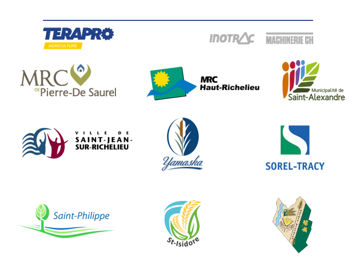 La Fédération de l’UPA de la Montérégie et ALUS Canada remercient également pour leur contribution financière : Inotrac et Machinerie CH du groupe Terapro (partenaire Bronze), MRC Pierre-De Saurel, MRC du Haut-Richelieu, Municipalité de Saint-Alexandre, Municipalité de Sainte-Victoire-de-Sorel, Ville de Sorel-Tracy, Ville de Saint-Jean-sur-Richelieu, Municipalité de Yamaska, Municipalité de Saint-Isidore et Municipalité de Saint-Philippe.